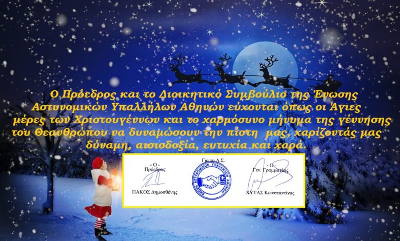 Ο Πρόεδρος και το Διοικητικό Συμβούλιο της Ένωσης Αστυνομικών Υπαλλήλων Αθηνών εύχονται όπως οι Άγιες μέρες των Χριστουγέννων και το χαρμόσυνο μήνυμα της γέννησης του Θεανθρώπου να δυναμώσουν την πίστη μας, χαρίζοντάς μας δύναμη, αισιοδοξία,ευτυχία και χαρά.