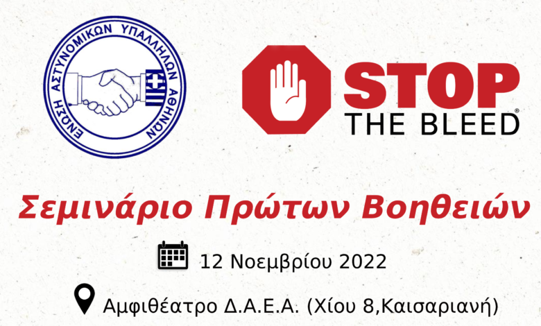 Η Ένωση Αστυνομικών Υπαλλήλων Αθηνών διοργανώνει ΔΩΡΕΑΝ για τα μέλη της, σεμινάριο με την επωνυμία : «STOP THE BLEED» το Σάββατο 12 Νοεμβρίου 2022  στο αμφιθέατρο Δ.Α.Ε.Α. (Χίου αρ.8, Καισαριανή) και περί ώρες πρωινές. Στο εν λόγω σεμινάριο οι συμμετέχοντες θα ενισχύσουν τις γνώσεις τους και θα εκπαιδευτούν στην ανάσχεση μαζικής αιμορραγίας σε περιστατικά που αντιμετωπίζουν εντός και εκτός υπηρεσίας, δίνοντας την ευκαιρία στο θύμα να επιβιώσει μέχρι την άφιξη της προ νοσοκομειακής φροντίδας, ενώ αποτελεί κατοχυρωμένη ονομασία του Υπουργείου Άμυνας των Η.Π.Α.