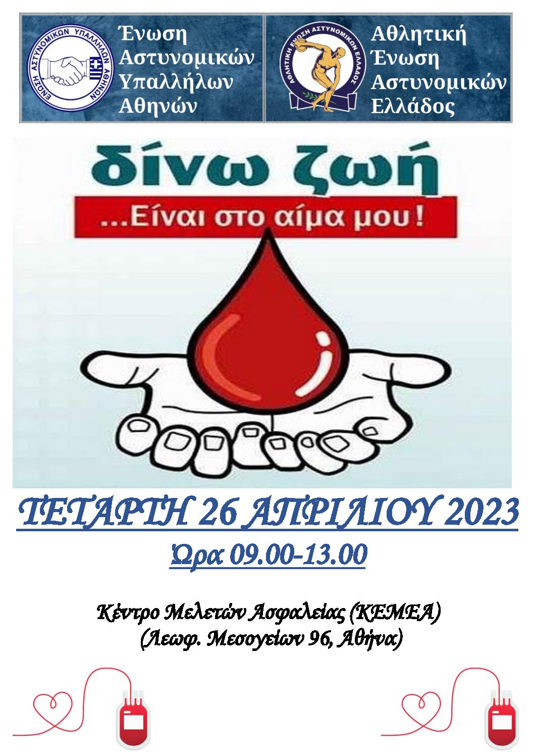 Σας ενημερώνουμε ότι την Τετάρτη 26 Απριλίου 2023 και από ώρα 09:00 έως 13:00, θα πραγματοποιηθεί κοινή εθελοντική αιμοδοσία από την Ένωση Αστυνομικών Υπαλλήλων Αθηνών και την Αθλητική Ένωση Αστυνομικών Ελλάδος στην Αίθουσα του Κέντρου Μελετών Ασφαλείας (Λεωφ. Μεσογείων 96, Αθήνα).
