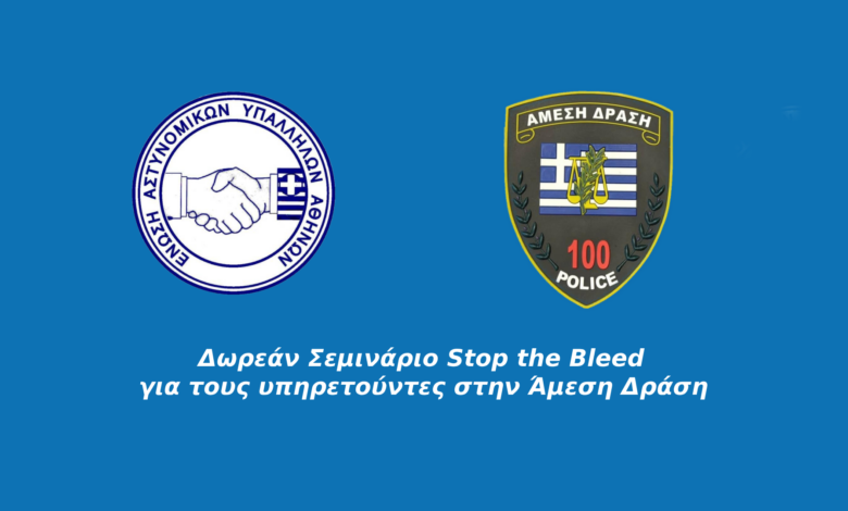 Η Ένωση Αστυνομικών Υπαλλήλων Αθηνών διοργανώνει ΔΩΡΕΑΝ σεμινάρια “Stop the Bleed” για τα μέλη της Ένωσης τα οποία υπηρετούν στη Διεύθυνση Άμεσης Δράσης Αττικής, την Τετάρτη 11 Δεκεμβρίου 2024 και την Παρασκευή 13 Δεκεμβρίου 2024 και ώρες 16:00-21:00, στο Αμφιθέατρο «Αρχιφύλακα ΛΥΓΓΕΡΙΔΗ Γεωργίου» οδό Χίου 8-Καισαριανή.