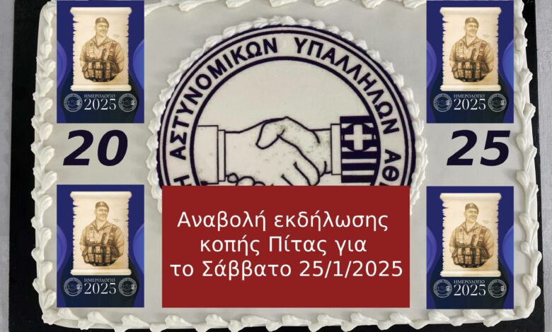 Εξαιτίας των πρόσφατων ανακατατάξεων και εξελίξεων που έλαβαν χώρα, η κοπή της πρωτοχρονιάτικης πίτας που είχε προγραμματιστεί για το προσεχές Σάββατο 18 Ιανουαρίου 2025, μετατίθεται για το επόμενο Σάββατο 25 Ιανουαρίου 2025 και ώρα 13.00 στην αίθουσα εκδηλώσεων του Κέντρου Μελετών Ασφάλειας (ΚΕ.ΜΕ.Α.) (Λ. Μεσογείων αρ.96, Πρώην Σχολή Αξιωματικών).