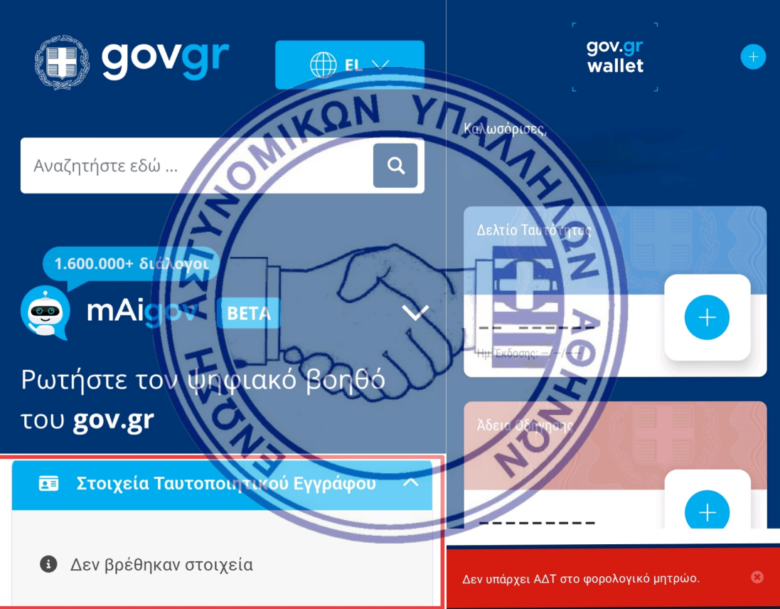 Ενδεικτικά σας αναφέρουμε ότι: όταν γίνεται προσπάθεια να εισαχθεί Δελτίο Ταυτότητας και Άδεια Οδήγησης στην πλατφόρμα Gov.gr Wallet εμφανίζεται το μήνυμα: “Δεν υπάρχει ΑΔΤ στο φορολογικό μητρώο” και στην πλατφόρμα eGov-KYK όταν πραγματοποιείται αναζήτηση για Στοιχεία Ταυτοποιητικού Ελέγχου εμφανίζεται ως σφάλμα: “Δεν βρέθηκαν στοιχεία”.