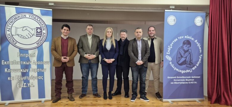 Στην εκδήλωση συμμετείχαν: η Πρόεδρος της Επιτροπής Εκπαιδευτικών Θεμάτων, Κοινωνικών Θεσμών και Εξωστρέφειας της Ένωσης, Αστυνόμος Β’ Σοφία Βαγενά, ο Ψυχολόγος της Ελληνικής Αστυνομίας Αλέξανδρος Καλαβρής και ο Ποινικολόγος – Διδάκτωρ Εγκληματολογίας Παναγιώτης Παπαϊωάννου. Παρευρέθηκαν επίσης ο Αντιπρόσωπος και Υπεύθυνος Κοινωνικών Θεμάτων της Επιτροπής Κωνσταντίνος Πατσιαούρας, ο Αντιπρόεδρος της Επιτροπής και Οργανωτικός Γραμματέας της Ένωσης Θεόδωρος Φούκας, καθώς και ο Ταμίας της Ένωσης Ιωάννης Κρόκος.